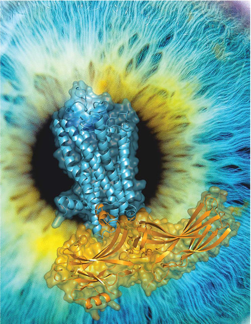 High-resolution 3D structure of Rhodopsin-arrestin complex. Blue, the structure of rhodopsin. Yellow, the structure of arrestin. Rhodopsin is a prototypical GPCR responsible for light perception and visual generation, a process arrestin is involved in. (Image by XU's lab)
