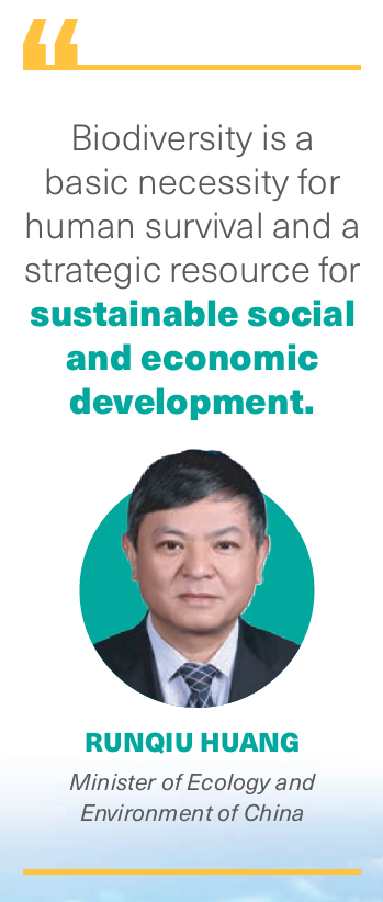 "Biodiversity is a basic necessity for human survival and a strategic resource for sustainable social and economic development. Safeguarding it is vital to national ecological security,” says Huang Runqiu, Minister of Ecology and Environment of China. “The global situation in terms of biodiversity loss is very serious, directly threatening food security, and the health, safety and well-being of every individual on Earth. China is highly involved in global biodiversity governance, playing an active role in solving global environmental challenges."