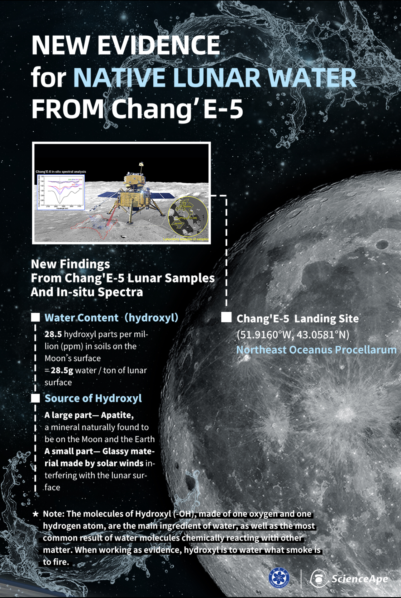 First detected by the lander's on-board lunar mineralogical spectrometer in 11 rock and soil samples and further confirmed by five additional multi-part laboratory analyses on eight of the samples, the hydroxyl was found to originate from two different sources. A small portion appeared in glassy material made by solar winds interfering with the lunar surface, just as it did in an Apollo 11 sample collected in 1971 and tested in the early 2000s. But the Chang'E-5 sample only contained about a third the amount of solar wind-generated, hydroxyl-containing glass as the Apollo sample.