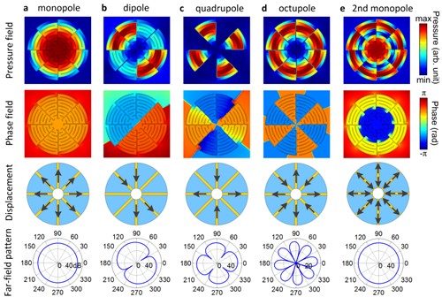 Fig. 1 Field distributions of acoustic Mie-resonance modes in air supported by the unit cell. a-e, Acoustic modes of the artificial monopole, dipole, quadrupole, octupole and second monopole, respectively. The first and second rows depict the distributions of pressure and phase fields (blue/red for small/large values), respectively. In the third row, the arrows indicate the displacements in the physical model equivalent to the realistic unit cell. In the fourth row, far-field patterns reconfirm the field distributions. Excellent agreement is observed. (Image by Prof. LIU Xiaojun’s group)