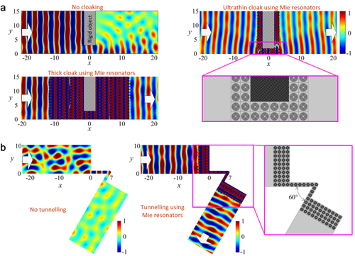 Fig. 2 Acoustic cloaking/tunnelling by using artificial Mie resonators. a, Upper-left: pressure map showing sound scattering by a rigid object (shaded region). The white arrows indicate the directions of wave propagation. Lower-left: resulting map when the object is embedded in a ρeff-near-zero metamaterial slab made of artificial Mie resonators. Note that the cloak is thick, like conventional designs. Right: efficient cloaking by an ultrathin cloak with only two layers of Mie resonators. b, Acoustic tunneling through a narrow channel with a 120° bent angle. Note that the energy transmittance is 87.5% (right) by using the line of the Mie resonators while it becomes 3% (left) without the Mie resonators. (Image by Prof. LIU Xiaojun's group)