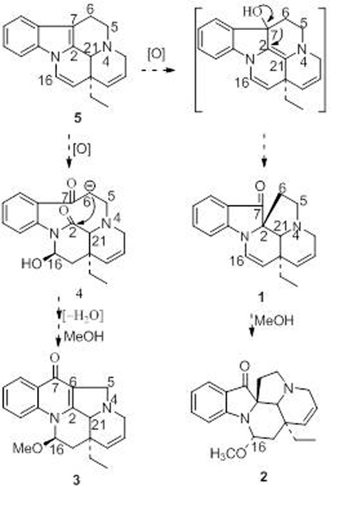 Proposed biogenetic relationships of compound1-5 isolated from Melodinus yunnanensis (Image by LUO Xiaodong, CAI Xianghai)