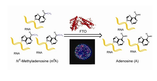 YANG and colleagues proved that FTO has efficient oxidative demethylation activity targeting the abundant m6A residues in RNA in vitro. FTO knockdown with siRNA led to increased amounts of m6A in mRNAs, whereas overexpression of FTO resulted in decreased amounts of m6A in human cells. Further study shows the partial colocalization of FTO with nuclear speckles, supporting the notion that m6A in nuclear RNAs is a major physiological substrate of FTO. This study suggests a new mode of biological regulation through reversible RNA methylation in mammalian cells.