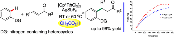 Vital to the success of this approach is the rational analysis of the proton-transfer effect involved in this conjugate addition reaction. With CH3CO2H as the solvent, the inherent substrate inhibition effect of this type of reaction could be successfully overcome allowing the reaction proceed smoothly under mild reaction conditions. This approach provides a new strategy to accomplish this type of C-H activation/addition process.