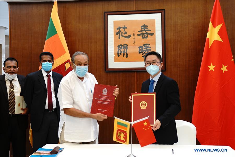 Hu Wei (1st R), Charge d'affaires of the Chinese Embassy in Sri Lanka, and Vasudeva Nanayakkara (2nd R), Sri Lankan Minister of Water Supply, pose for a photo after signing a supplementary agreement in Colombo, capital of Sri Lanka, on Oct. 14, 2020. Sri Lanka and China on Wednesday signed a supplementary agreement on a Memorandum of Understanding on water research and technology cooperation, aimed at providing clean drinking water to several areas of the island country, a statement from the Chinese Embassy to Sri Lanka said. (Xinhua/Tang Lu)