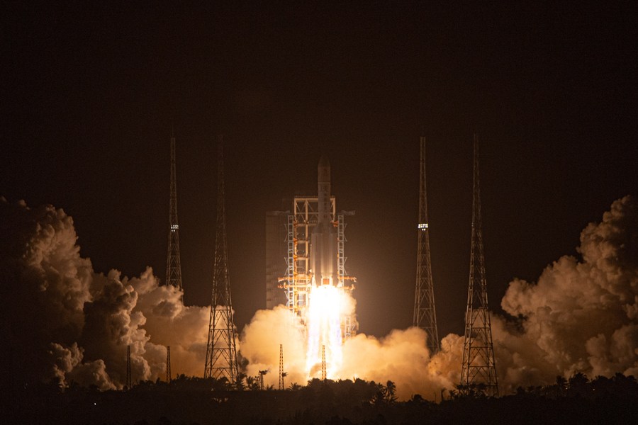 A Long March-5 rocket, carrying the Chang'e-5 spacecraft, blasts off from the Wenchang Spacecraft Launch Site on the coast of southern island province of Hainan, Nov. 24, 2020. China on Tuesday launched a spacecraft to collect and return samples from the moon, the country's first attempt to retrieve samples from an extraterrestrial body. (Xinhua/Zhang Liyun)
