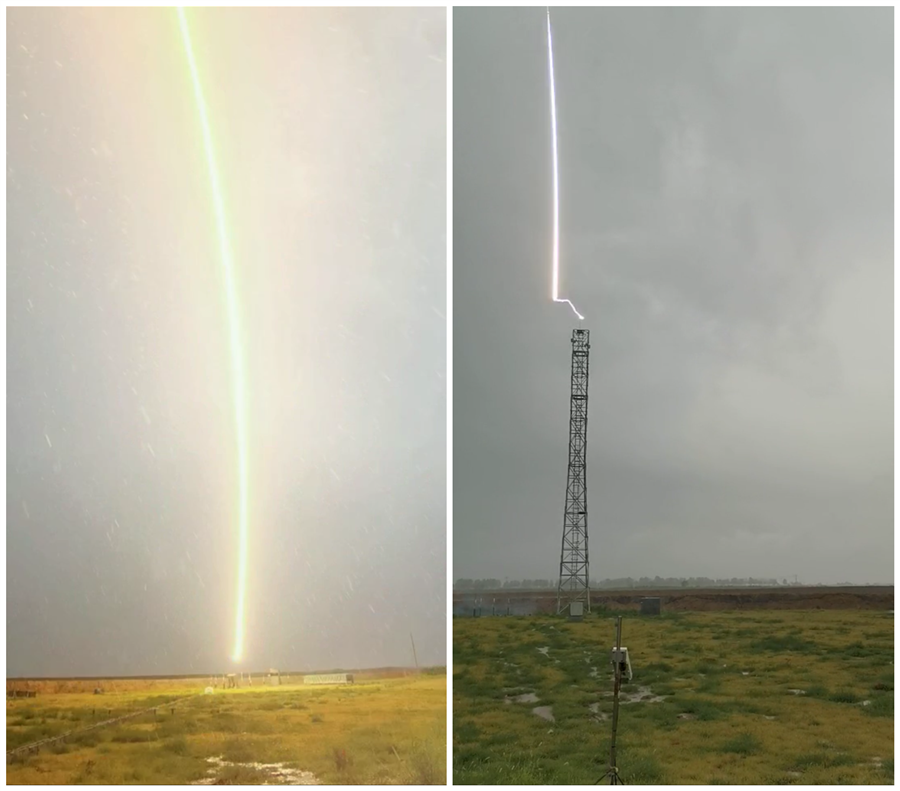 Two positive lightning flashes, which have rarely been triggered around the world before, were successfully triggered on July 31 and August 13, striking ground equipments (left, with classical triggering technique), and a 30-m communication tower (right, with altitude triggering technique). (Image by the SHATLE team)