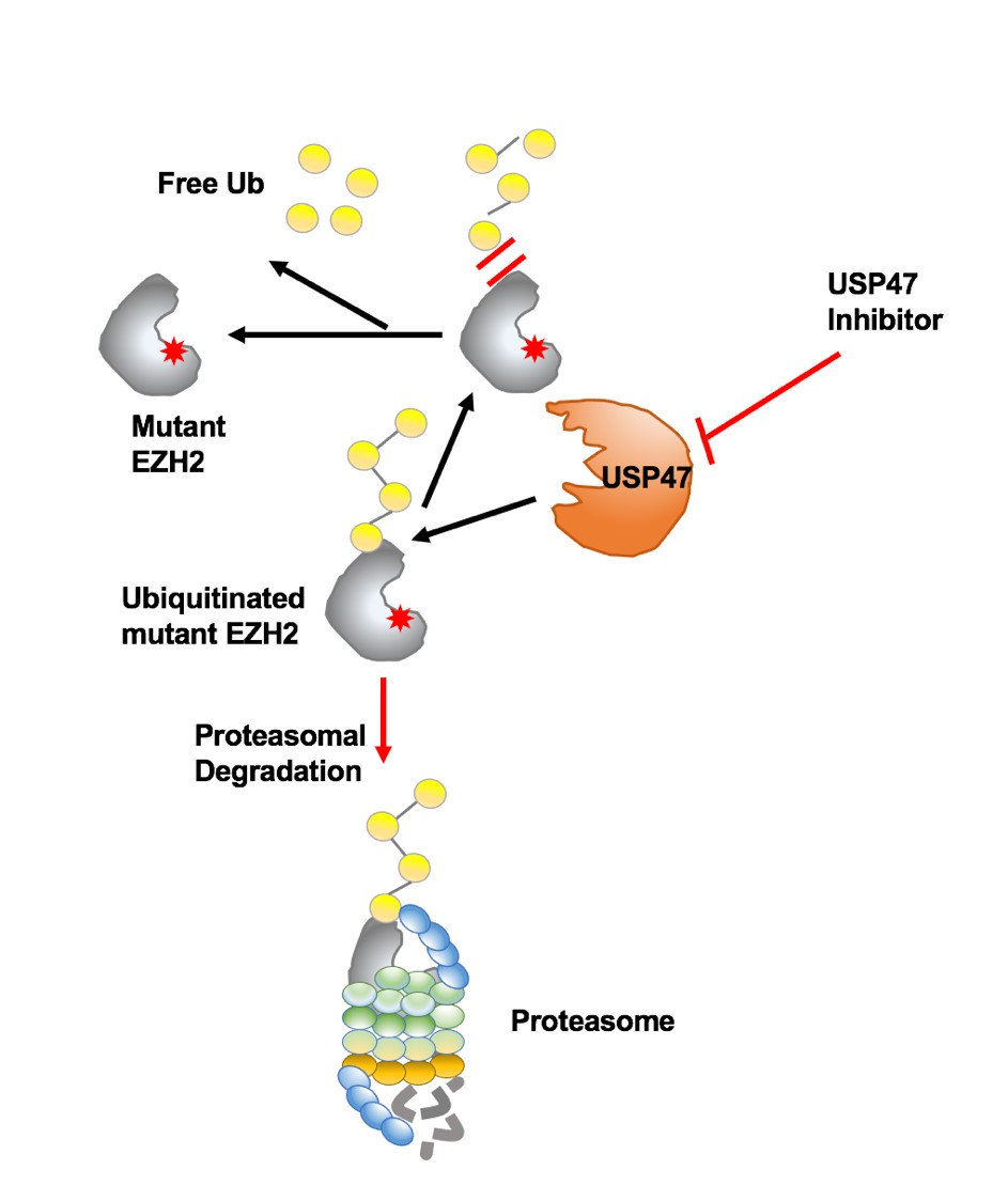 Mechanically, USP47 is highly expressed in mutant EZH2-expressing cells, associates with and stabilizes mutant EZH2 over wt EZH2. Inhibition of USP47 spares wt EZH2 in normal cells thus circumventing the adverse side effects in clinical treatment.