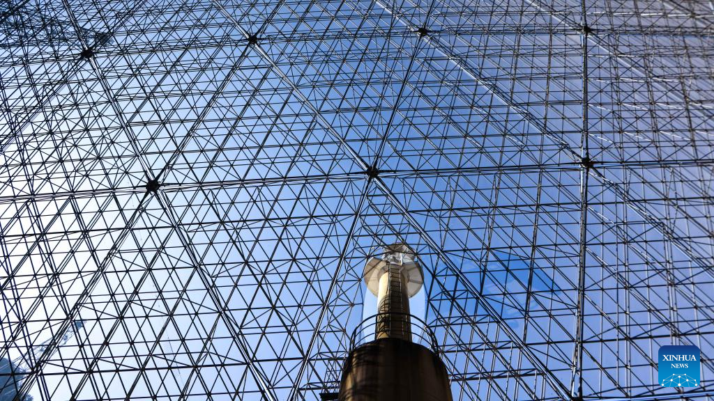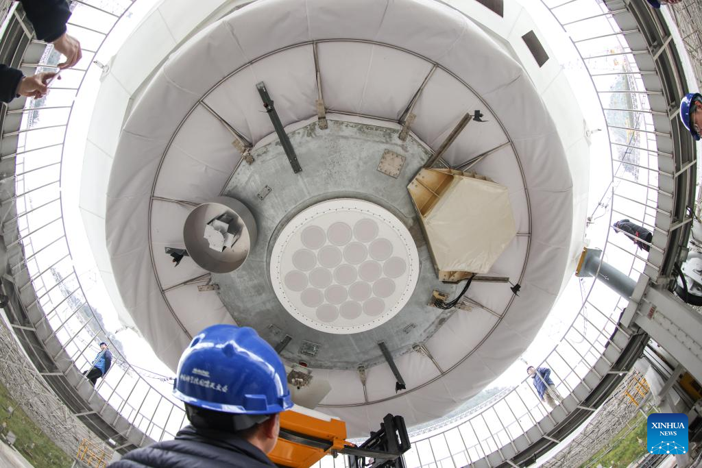 Photo taken on Dec. 19, 2021 shows the feed cabin during a regular maintenance operation to the Five-hundred-meter Aperture Spherical Radio Telescope (FAST) in southwest China's Guizhou Province. (Xinhua/Ou Dongqu)