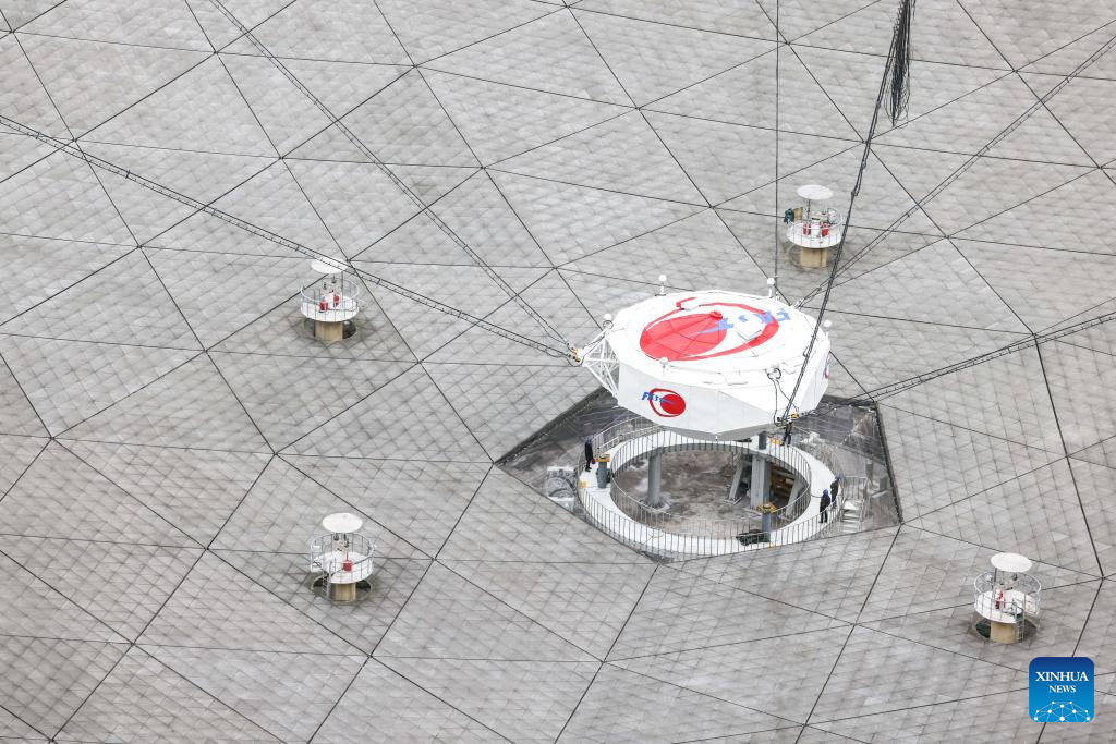 A staff member checks reflector panels during a regular maintenance operation to the Five-hundred-meter Aperture Spherical Radio Telescope (FAST) in southwest China's Guizhou Province, Dec. 17, 2021.(Xinhua/Ou Dongqu)