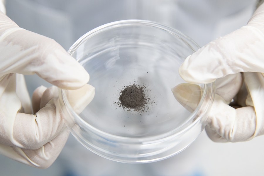A researcher holds lunar samples at the Institute of Geology and Geophysics of the Chinese Academy of Sciences in Beijing, capital of China, Oct. 15, 2021. (Xinhua/Jin Liwang)
