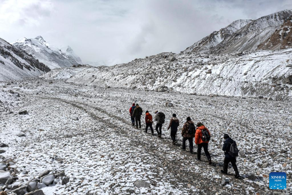 Aerial photo taken on May 1, 2022 shows members of a scientific research team marching towards East Rongbuk glacier on Mount Qomolangma. (Xinhua/Sun Fei)