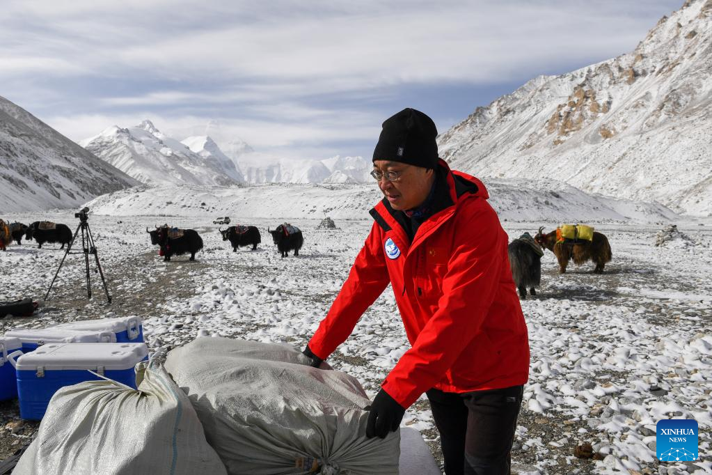 Kang Shichang, leader of a scientific research team, checks supplies before a scientific expedition at the Mount Qomolangma base camp, May 1, 2022. (Xinhua/Jiang Fan)