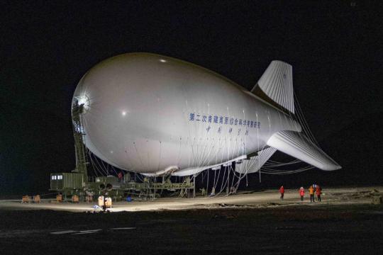 The Jimu 1 aerostat is prepared for takeoff on Sunday in the Tibet autonomous region. (SUN FEI/XINHUA)