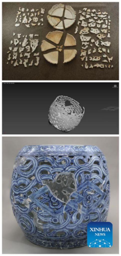 Combined file photo shows the restoration process of a ceramic seat from the Ming Dynasty (1368-1644) at Jingdezhen Imperial Kiln Institute in the city of Jingdezhen, east China's Jiangxi Province. (Xinhua)