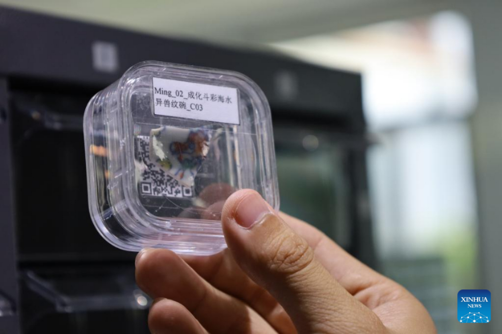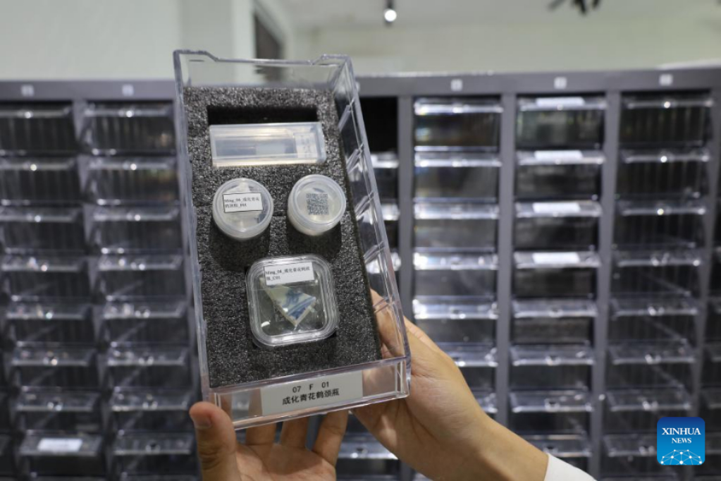Photo taken on June 8, 2022 shows a staff member displaying "gene" specimens of ceramics from the Ming Dynasty (1368-1644) at Jingdezhen Imperial Kiln Institute in the city of Jingdezhen, east China's Jiangxi Province. (Photo by Wang Kaifeng/Xinhua)