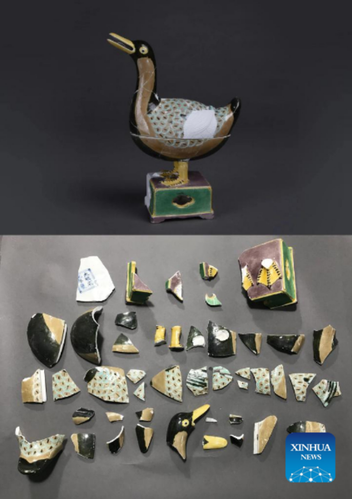 Combined file photo shows a restored three-colored duck-shaped incense burner (top) from the Ming Dynasty (1368-1644) and its relics before restoration at Jingdezhen Imperial Kiln Institute in the city of Jingdezhen, east China's Jiangxi Province. (Xinhua)