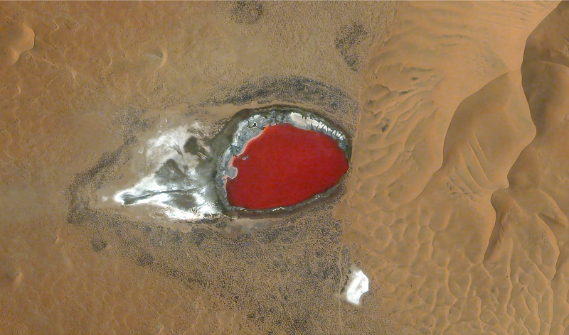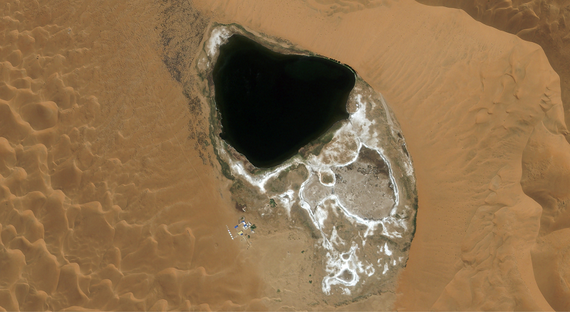 A photo from the Jilin-1 satellite shows a small lake on the edge of the city in the Mingsha Mountain in Dunhuang, Gansu province. [Photo by Changguang Satellite Technology/For chinadaily.com.cn]