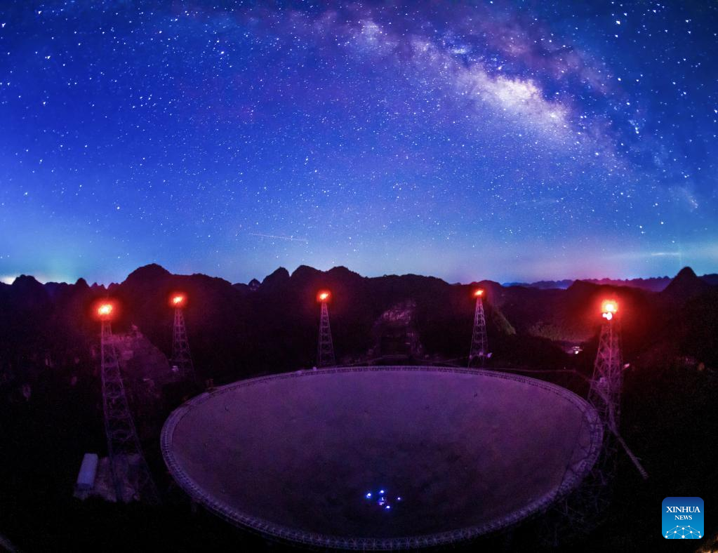 The long-time exposure photo taken on July 24, 2022 shows China's Five-hundred-meter Aperture Spherical Radio Telescope (FAST) under maintenance in southwest China's Guizhou Province. Using FAST, or the "China Sky Eye," scientists have identified over 660 new pulsars. (Xinhua/Ou Dongqu)
