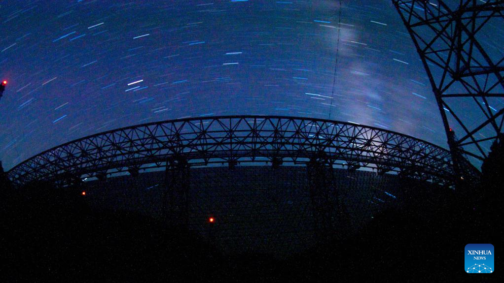 The long-time exposure photo taken on July 25, 2022 shows China's Five-hundred-meter Aperture Spherical Radio Telescope (FAST) under maintenance in southwest China's Guizhou Province. Using FAST, or the "China Sky Eye," scientists have identified over 660 new pulsars. (Xinhua/Ou Dongqu)