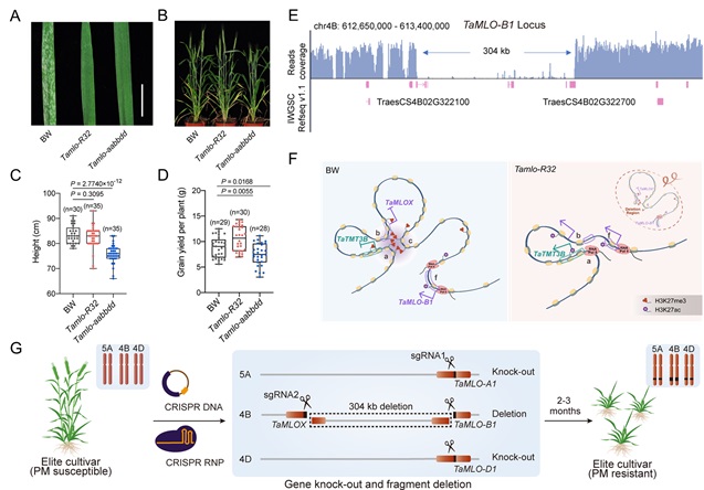 In this study, the researchers found that the Tamlo-R32 mutant harbors a large 304-kilobase pair deletion in the TaMLO-B1 locus in addition to two premature stop codons in the TaMLO-A1 and TaMLO-D1 loci. Notably, the large deletion in the wheat B genome resulted in an altered local chromatin landscape, leading to the ectopic activation of TaTMT3B.