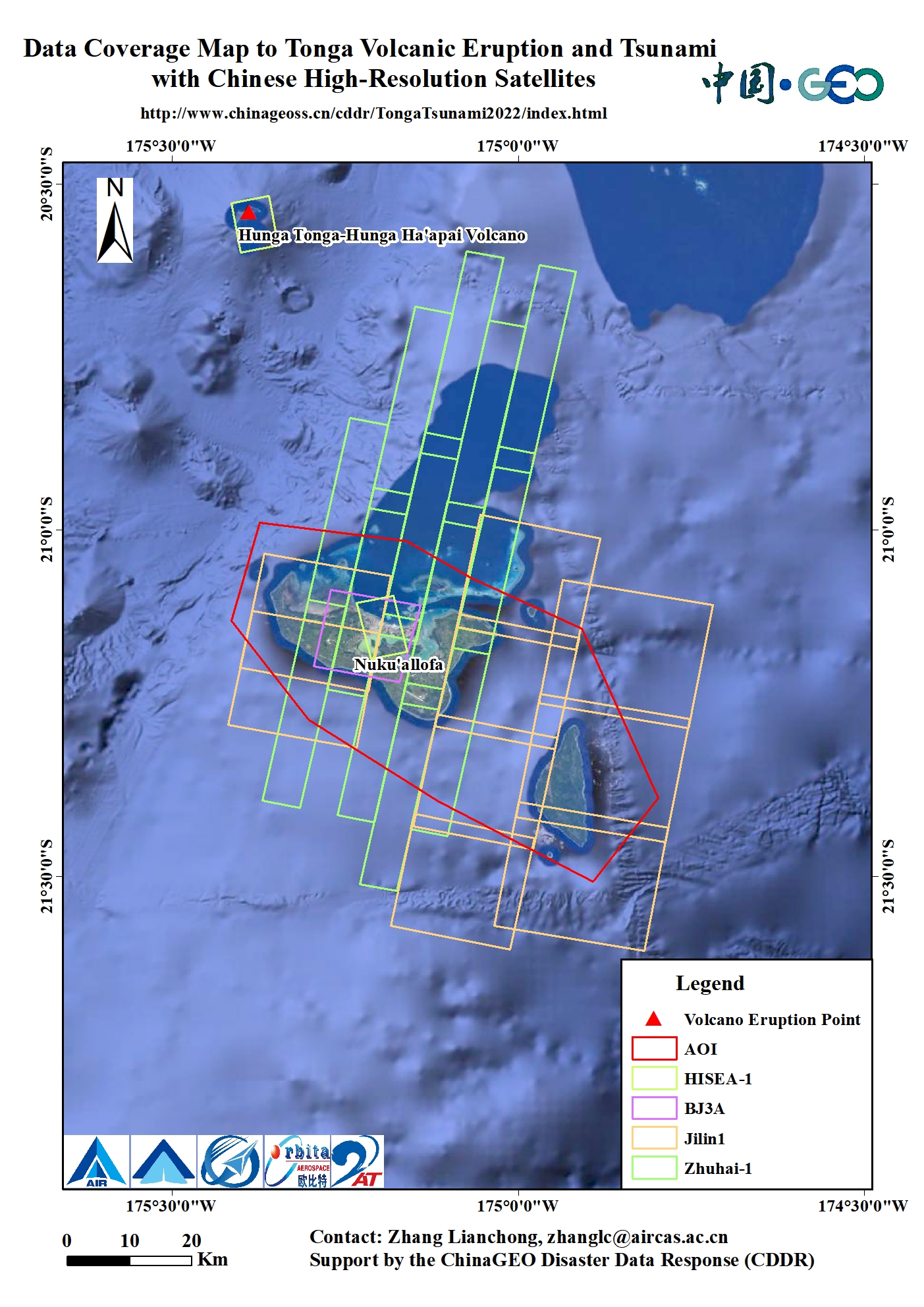 Fig. 1. Data Coverage Map to Tonga Volcano Eruption and Tsunami with Chinese High-resolution Satellites. (Image by Aerospace Information Research Institute)