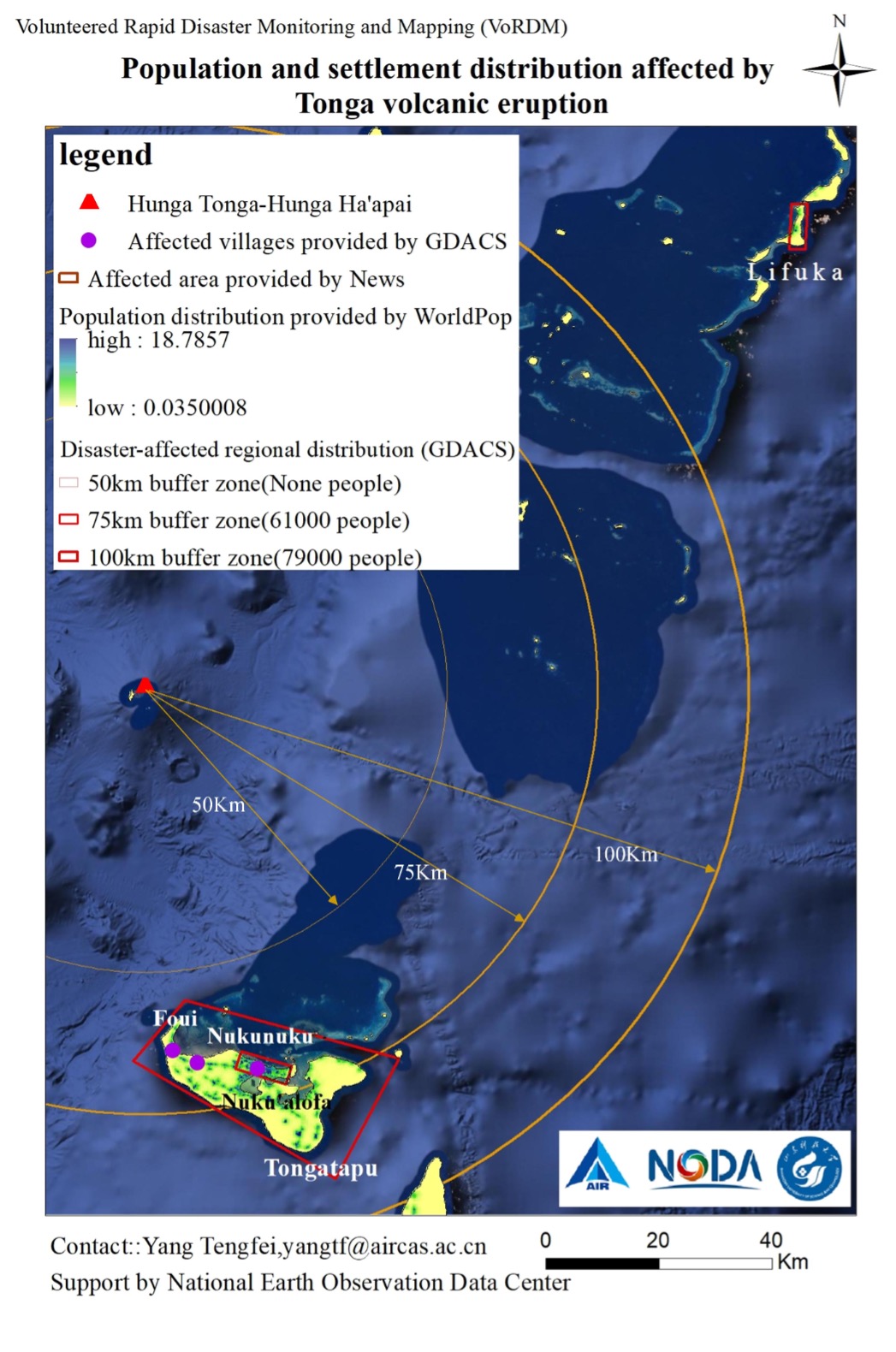 Fig. 3. Distribution Map of Population and Settlement affected by Tonga Volcanic Eruption. (Image by Aerospace Information Research Institute)