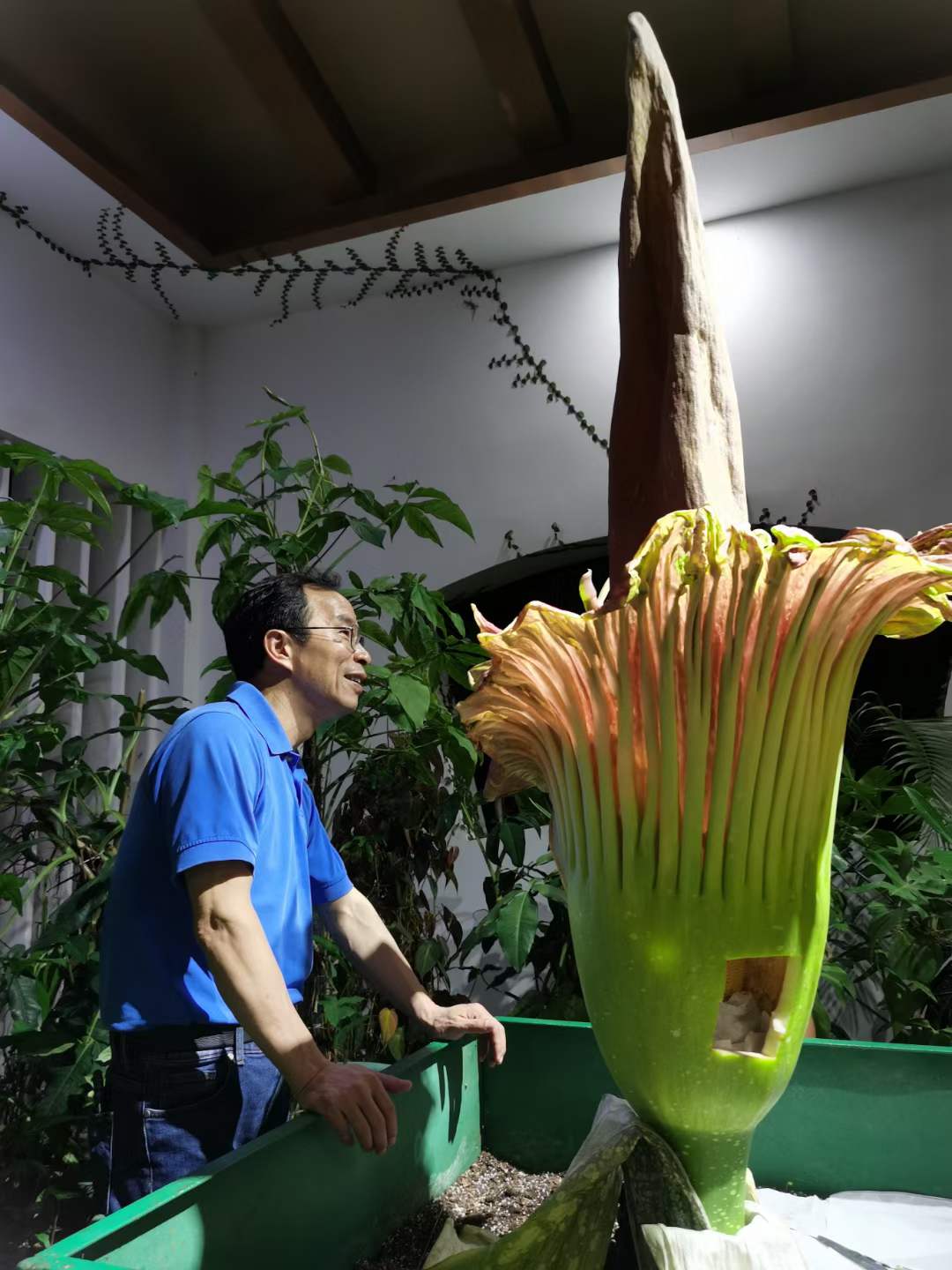Prof. YANG Yongping observing Amorphophallus titanum in bloom at XTBG. (Image by XTBG)