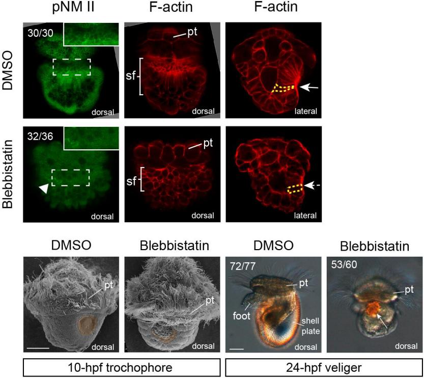 In normal development, tissues from lateral and ventral sides rearranged to the dorsal side to form the shell field with a characteristic rosette-like pattern. This critical process was prevented when inhibiting NM II, resulting in a disorganized shell field (despite largely unaffected gene expression patterns). The nascent shell plate could not be formed in these manipulated embryos, which then developed to shell-less veliger larvae.