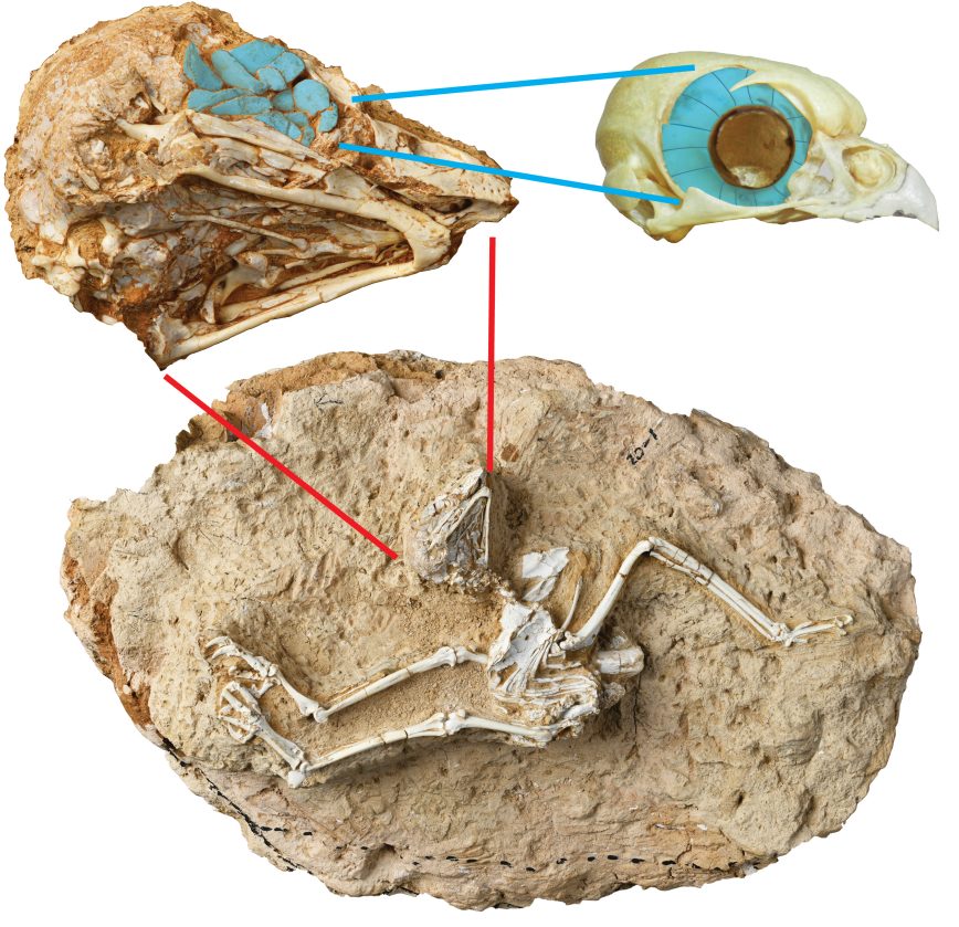 Fig 1. Fossil skeleton of the daytime active owl Miosurnia diurna from China (below) with an expanded view of the skull (top left). The eye bones or scleral ossicles are false colored blue and set in comparison with an intact ring in the skull of a pygmy owl Glaucidium (top right). (Image by IVPP)