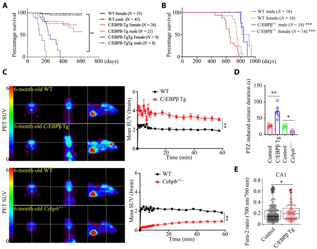 Fig. 1 Neuronal C/EBPβ escalation shortens the life span of mice, leading to neural excitation. (Image by SIAT)