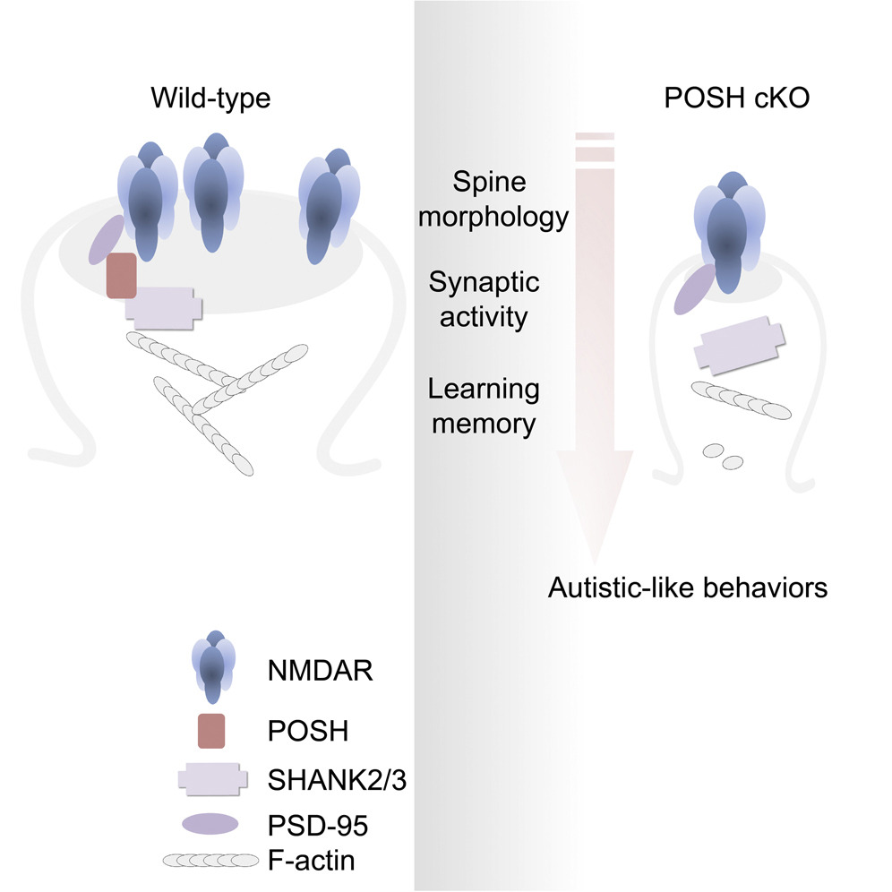 In this study, the researchers found that the scaffold protein POSH clusters at excitatory synapses, together with two other scaffold proteins, PSD95 and SHANK2/3. Mice with brain specific conditional knockout (cKO) of POSH display profound autistic-like behaviors including impairments in social interactions, social communication, repetitive behaviors and deficits in learning and memory.