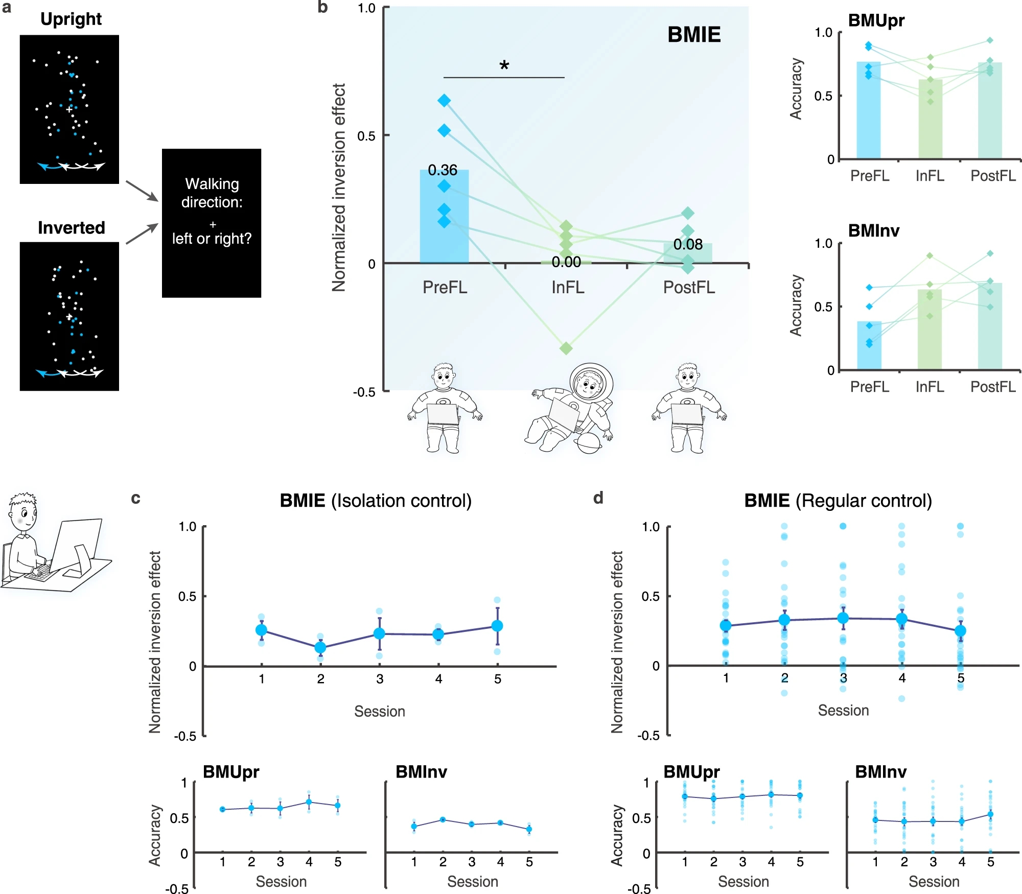 Experimental design (a) and results for the space experiment (b) and the ground-based control experiments (c & d). BMIE: the normalized BM inversion effect; BMUpr & BMInv: task performances for the upright and inverted conditions. (Image by WANG Ying)