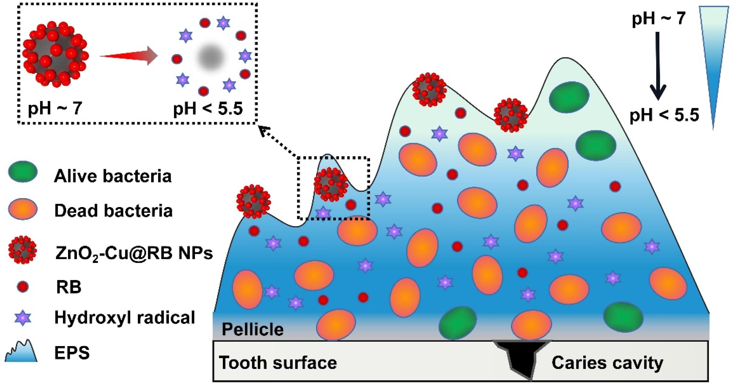 They also revealed that ZnO2-Cu@RB NPs (at a concentration of 256 μg mL-1) killed more than 8.0 log10 of S. mutans embedded in the EPS-rich matrix.