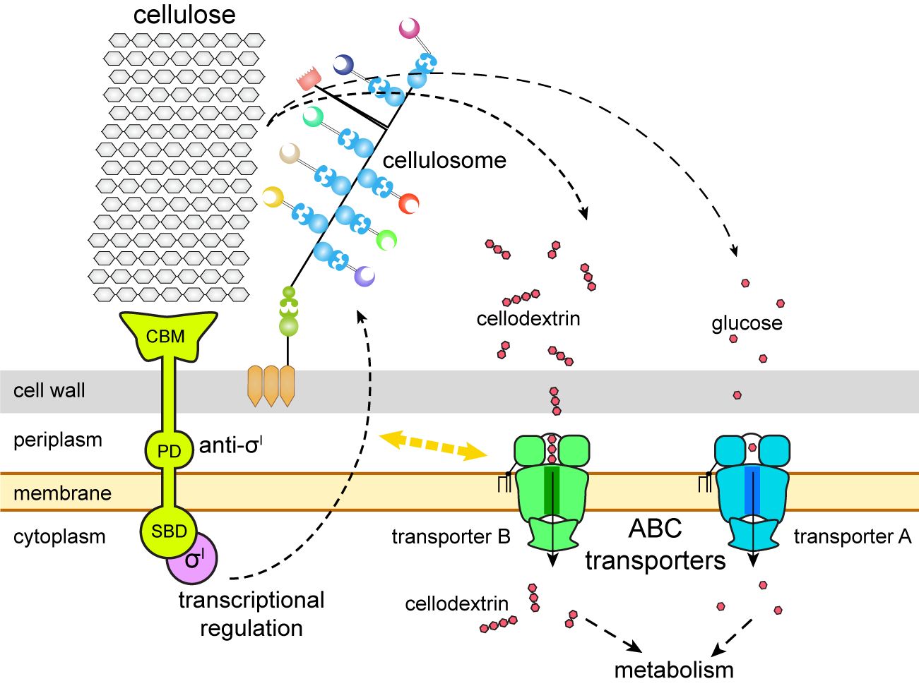 Cartoon model of cellulosome regulation and sugar transporters in Clostridium thermocellum. (Image by FENG Yingang)