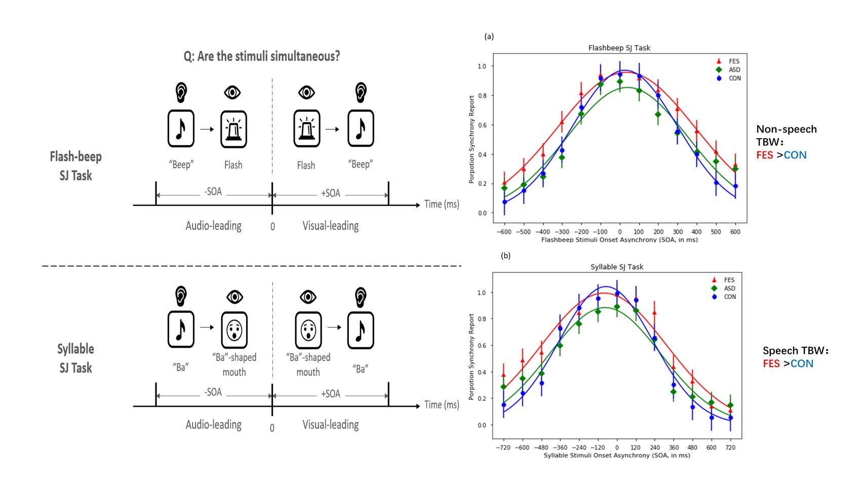 According to the researchers, participants with FES exhibited widened temporal binding window affecting both speech and non-speech processing, which were not attributable to altered unisensory sensory acuity because they had normal visual and auditory TOJ thresholds. However, adults with ASD exhibited intact unisensory and audiovisual temporal processing.
