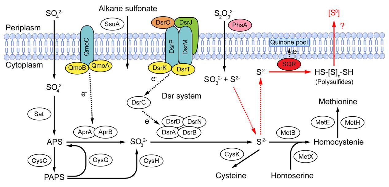 They further revealed that thiosulfate reductase (PhsA) and the sulfide quinone oxidoreductase (SQR) played key roles in driving ZVS formation in O. marinus CS1 by proteomic and protein activity assays. In this process, O. marinus CS1 firstly reduced thiosulfate to form sulfide by PhsA, and then produced ZVS from sulfide oxidation by SQR.