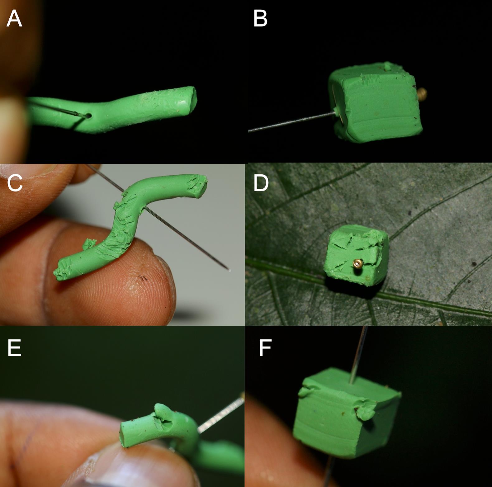 Bite and scar imprint likely left by (A, B) ants, (C, D) non-ant invertebrates, and (E, F) vertebrates (rodents) on plasticine (A, C, E) caterpillars and (B, D, F) cubes deployed in a monsoonal tropical rainforest of south-eastern China. (Images by Thilina S. Nimalrathna)
