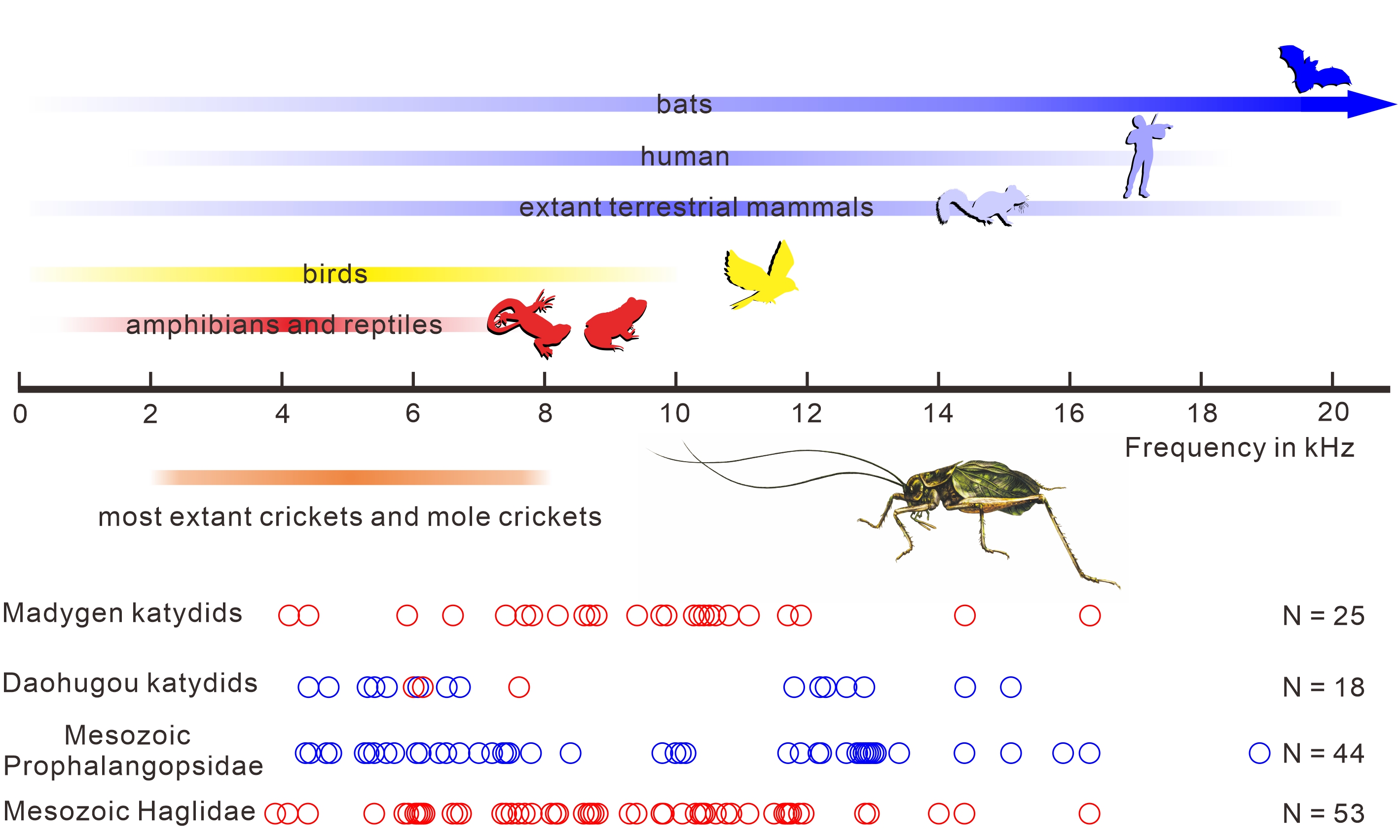 Fig. 2 Frequency range of hearing in vertebrates (above) and frequency range of tones used by extant crickets and fossil katydids (below). (Image by NIGPAS)