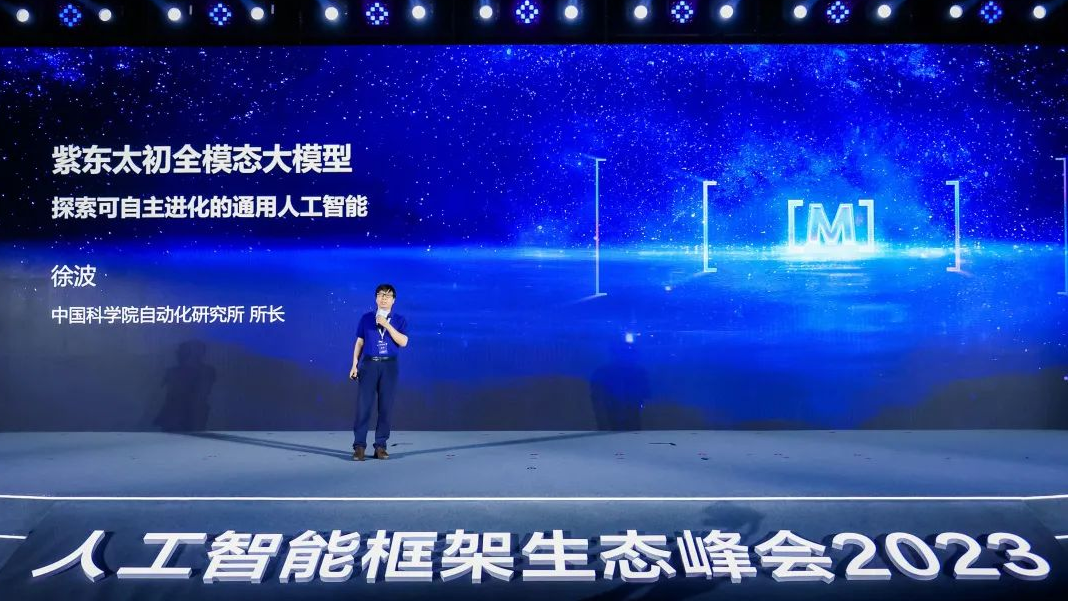Xu Bo, chief of Institute of Automation under Chinese Academy of Sciences unveils next-generation AI model, "Zidongtaichu" 2.0, in Shanghai, June 16, 2023. /Chinese Academy of Sciences