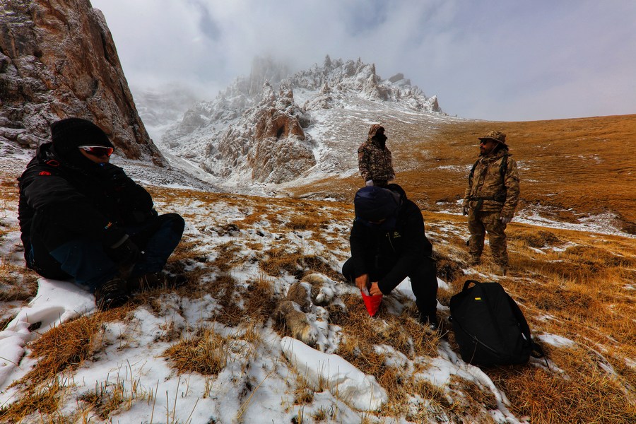 This file photo taken in March 2019 shows Lian Xinming (R, front) collecting samples in the Sanjiangyuan area in northwest China's Qinghai Province. (Xinhua)