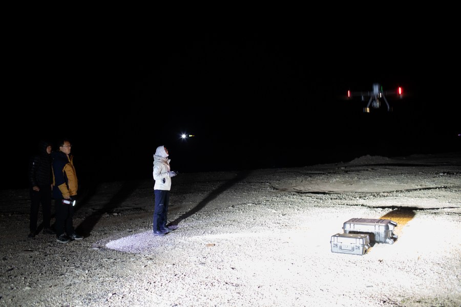 Lian Xinming and his team members use a drone to monitor an overnight habitat of Tibetan antelopes during their migration near the Qumar River Bridge along the Qinghai-Tibet Highway in Hoh Xil, a natural reserve in northwest China's Qinghai Province, on the early hours of June 16, 2023. (Xinhua/Jin Liwang)