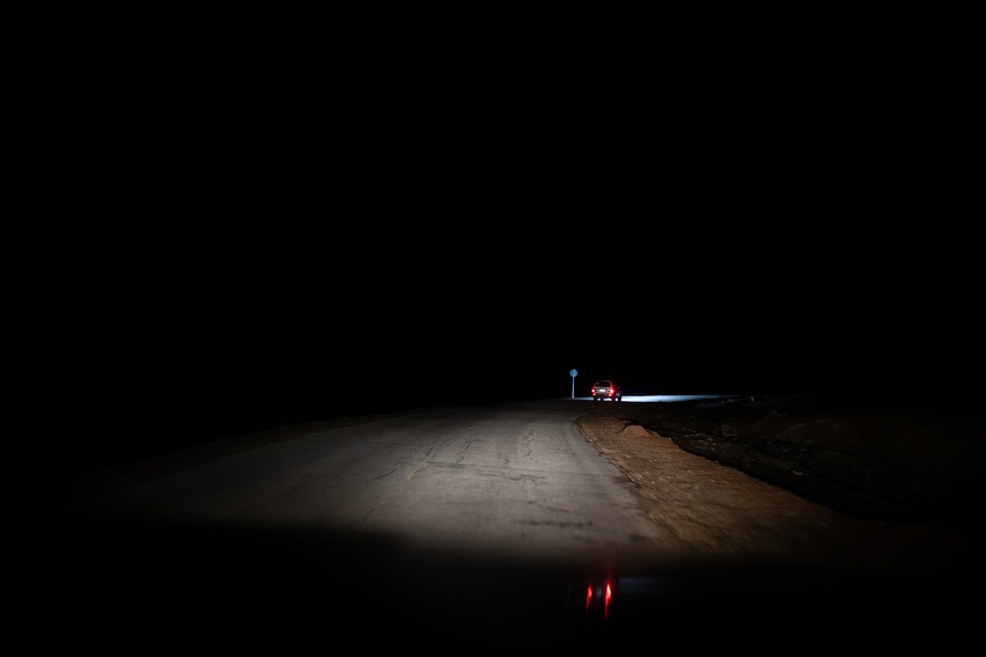 Lian Xinming and his team members drive to an overnight habitat of Tibetan antelopes during their migration near the Qumar River Bridge along the Qinghai-Tibet Highway in Hoh Xil, a natural reserve in northwest China's Qinghai Province, on the early hours of June 16, 2023. (Xinhua/Jin Liwang)