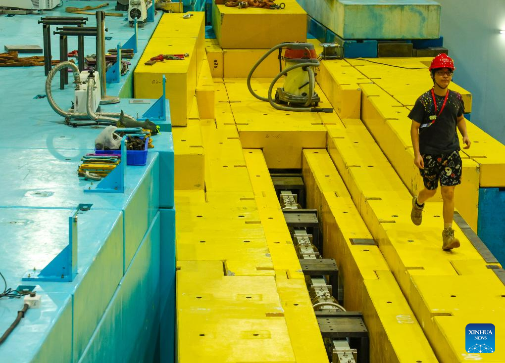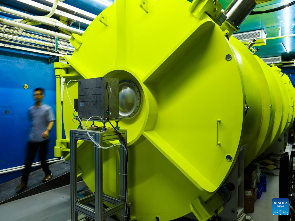A researcher walks past the very small angle neutron scattering (VSANS) chamber system of China Spallation Neutron Source (CSNS) in Dongguan, south China's Guangdong Province, July 18, 2023. (Xinhua/Liu Dawei)