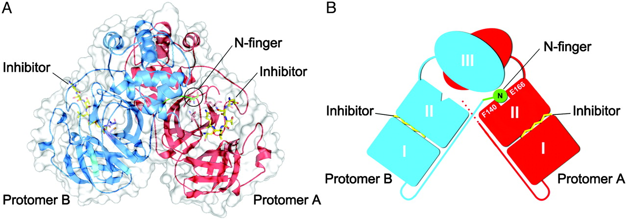 The picture shows the SARS-CoV main protease dimer structure complexed with a substrate-analogue hexapeptidyl CMK inhibitor published in the journal PNAS on October 29, 2003. /PNAS