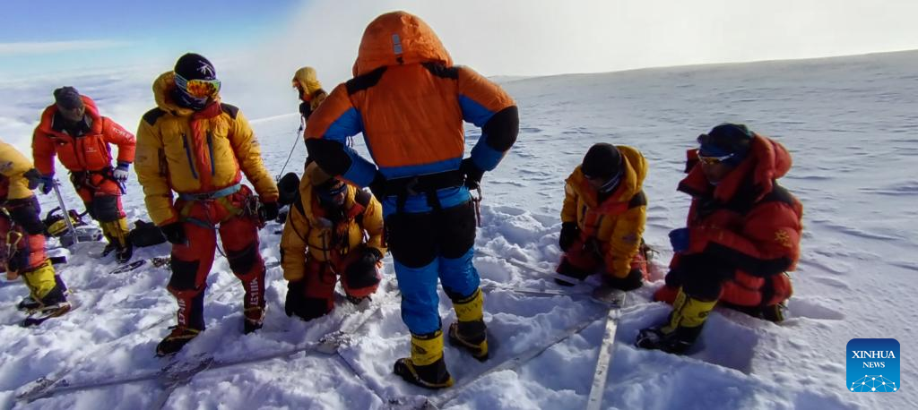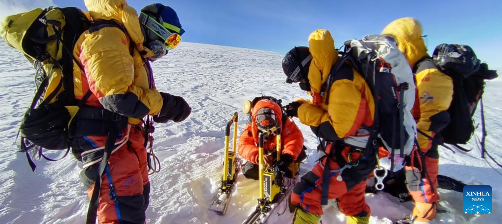 Members of a Chinese expedition team measure the thickness of snow and ice on the summit of Mount Cho Oyu, Oct. 1, 2023. A Chinese expedition team comprising 18 members reached the summit of Mount Cho Oyu, also known as Mt. Qowowuyag, at 9:15 a.m. on Sunday to carry out scientific research on the world's sixth-highest peak. (Xinhua)