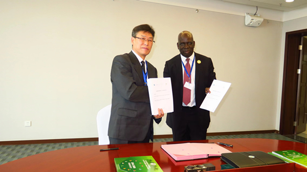 Lei Jiaqiang (L), on behalf of the Xinjiang Institute of Ecology and Geography, Chinese Academy of Sciences, signs a memorandum of cooperation with Abdoulaye Dia, the then executive secretary of the Pan-African Agency of the Great Green Wall, in Erdos, north China's Inner Mongolia Autonomous Region, September 15, 2017. /Courtesy of Lei Jiaqiang