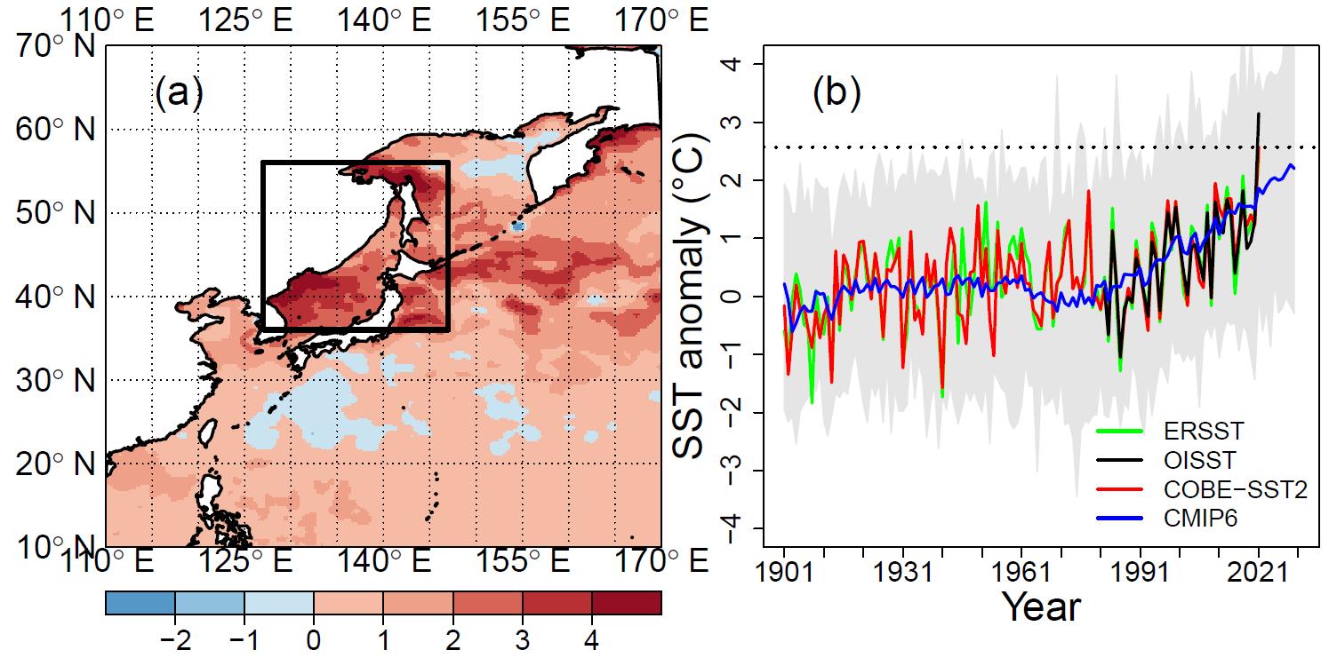 In July 2021, an unprecedented MHW hit the northwest Pacific Ocean (NWP), featuring sea surface temperature anomalies (SSTa) larger than 4 °C in some coastal areas of the Japan (East) Sea and Okhotsk Sea. This event triggered an unprecedented widespread outbreak of harmful algae in the coastal waters, causing serious damage to marine ecosystems and coastal fisheries.