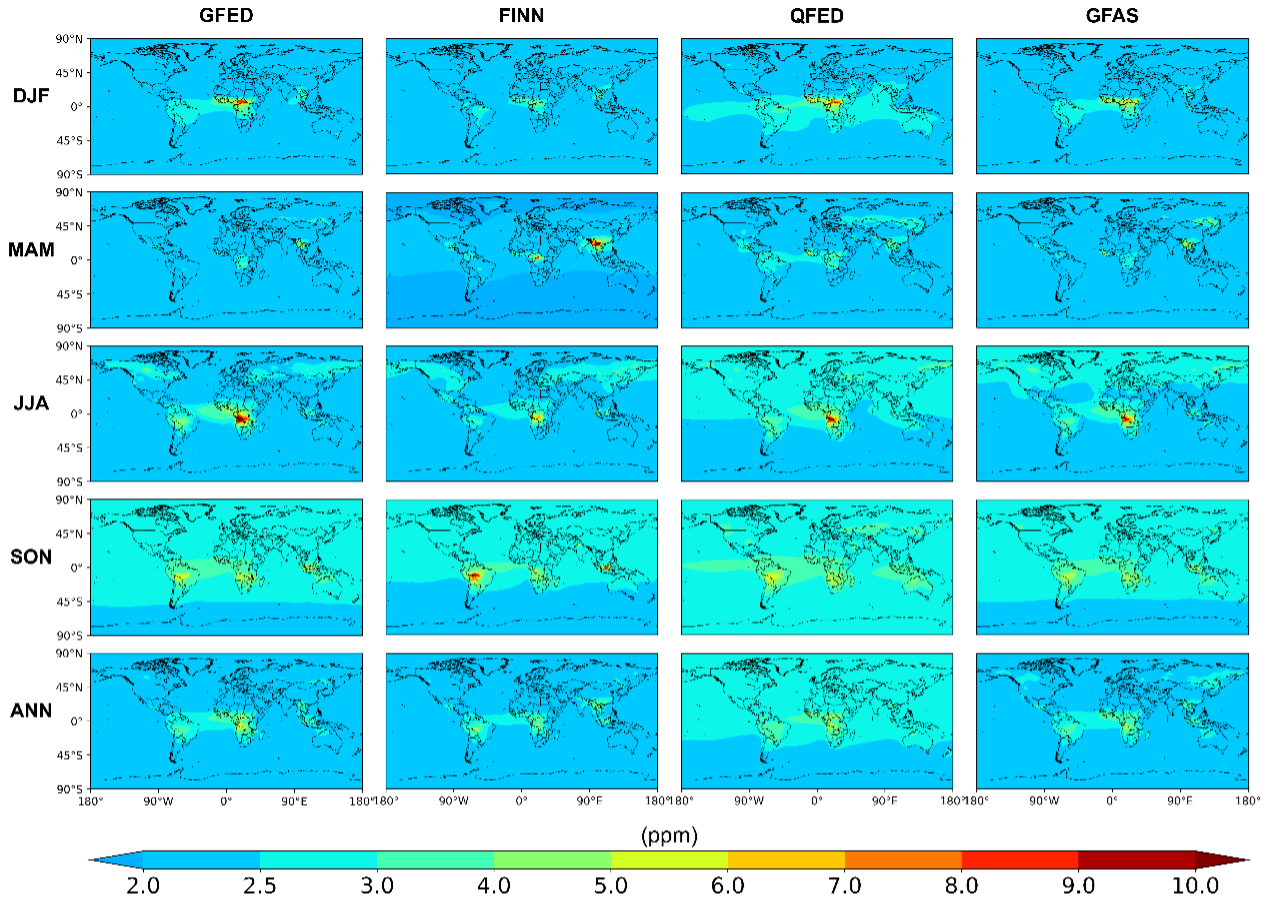 Global fires have widespread impacts on global carbon cycle and atmospheric environment with immediate direct carbon emissions. Fire carbon emission has substantial spatiotemporal variabilities and contributes to the dynamics of global CO2 distributions and variances.