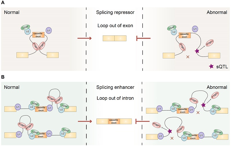 In addition, by integrating cancer-related splicing quantitative trait loci (sQTLs) with PTBP1-associated RRIs, the researchers identified 121 sQTLs that potentially affect splicing by altering RNA loops. Unexpectedly, one sQTL located in the intronic loops of HERPUD2 can induce exon 7 skipping, thus generating a short isoform to promote the proliferation of HeLa cells. These results demonstrate how cancer-related non-coding mutations modulate RNA spatial conformation to promote tumor cell growth.